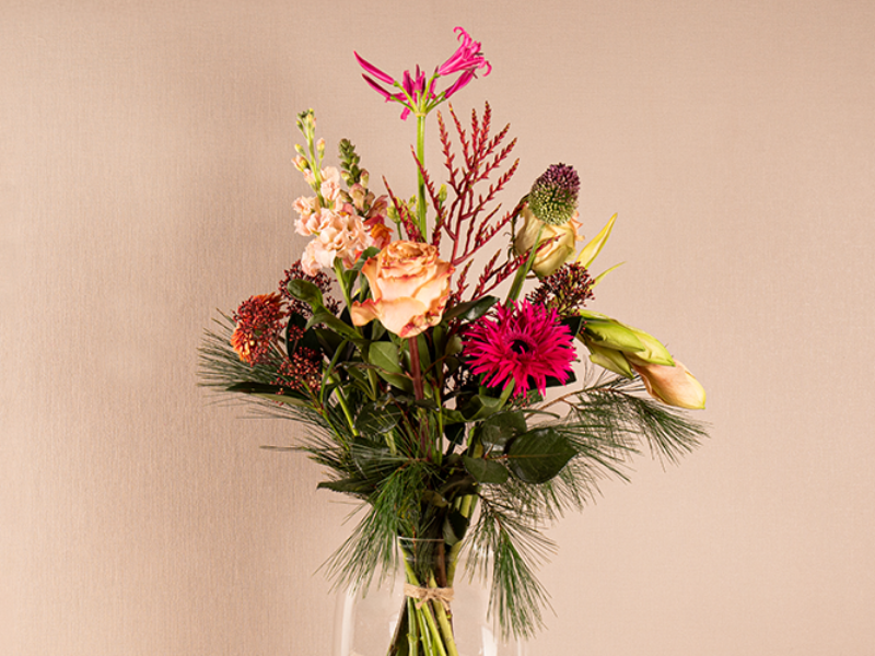 Een liefdevol kerstboeket met een verrassende mix van roze, besjes en dennengroen.