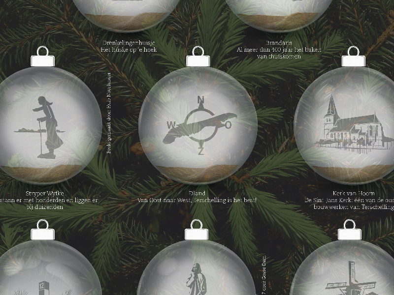 De complete set van 8 handgestraalde Terschellinger kerstballen