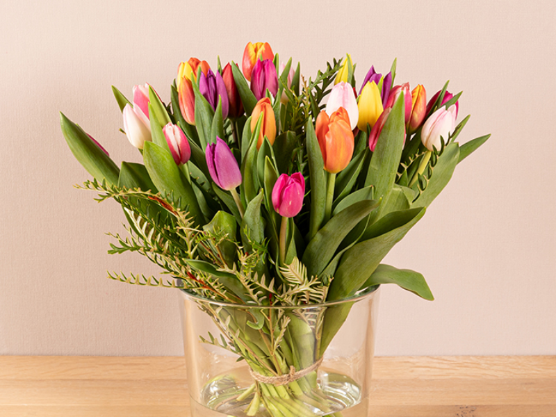 Handgebonden boeket met tulpen in gemengde kleuren en bijpassend groen