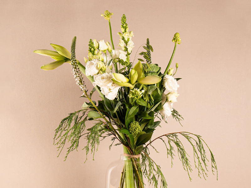 Weelderig winterboeket met bloemen van het seizoen en groene accenten zoals sierlijke conifeer.